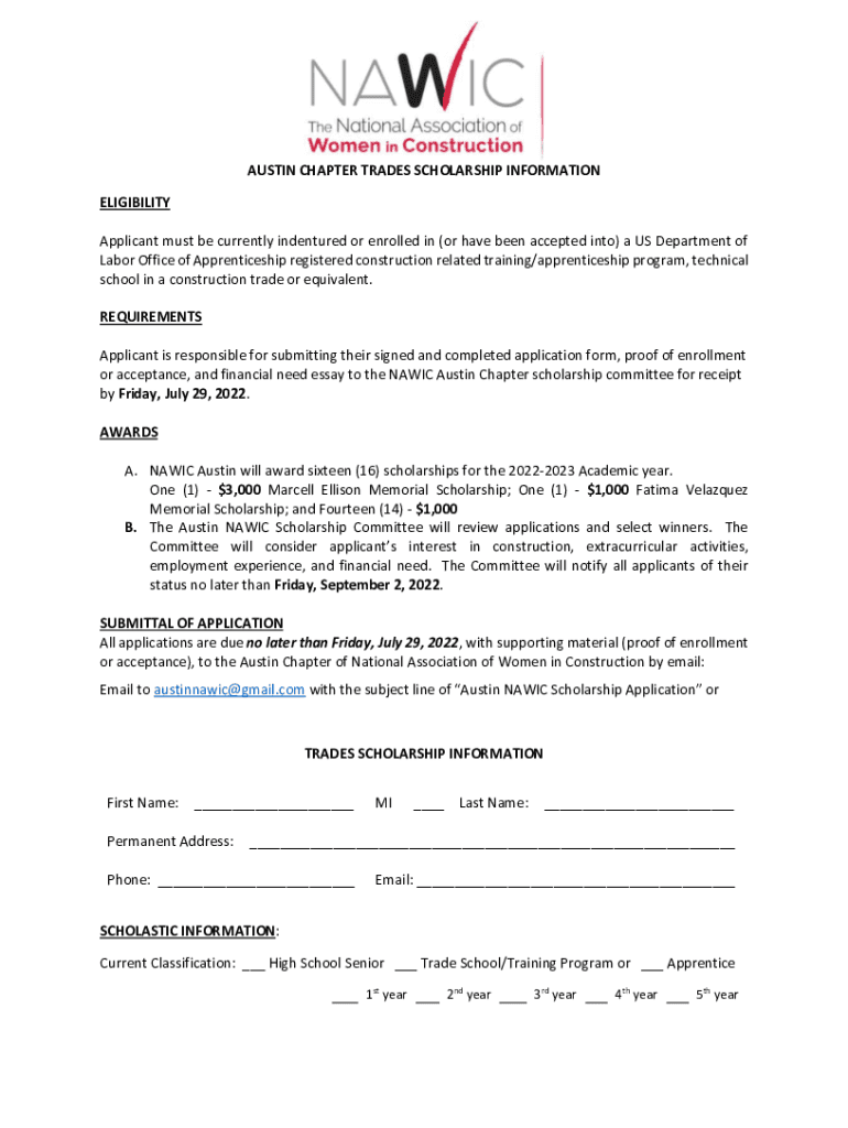 AUSTIN CHAPTER TRADES SCHOLARSHIP INFORMATION ELIGIBILITY Applicant must be currently indentured or enrolled in (or have been accepted into) a US Department of Labor Office of Apprenticeship registered