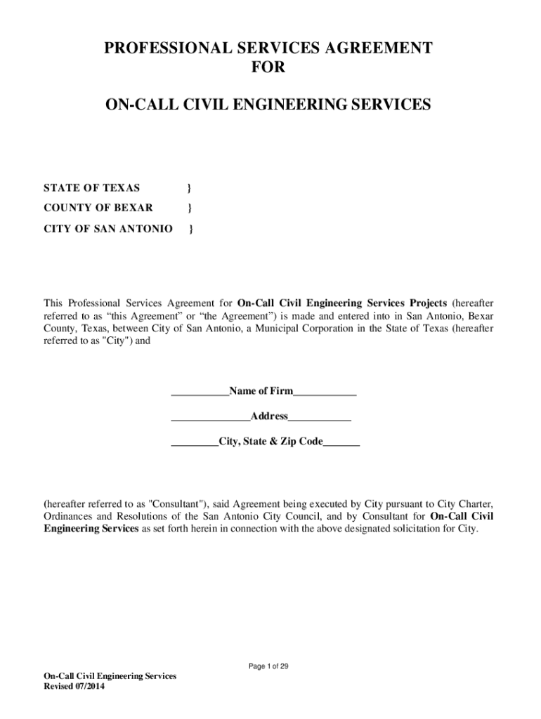 PROFESSIONAL SERVICES AGREEMENT FOR CALL CIVIL ENGINEERING SERVICESSTATE OF TEXASCOUNTY OF SCARCITY OF SAN ANTONIOThis Professional Services Agreement for Call Civil Engineering Services Projects