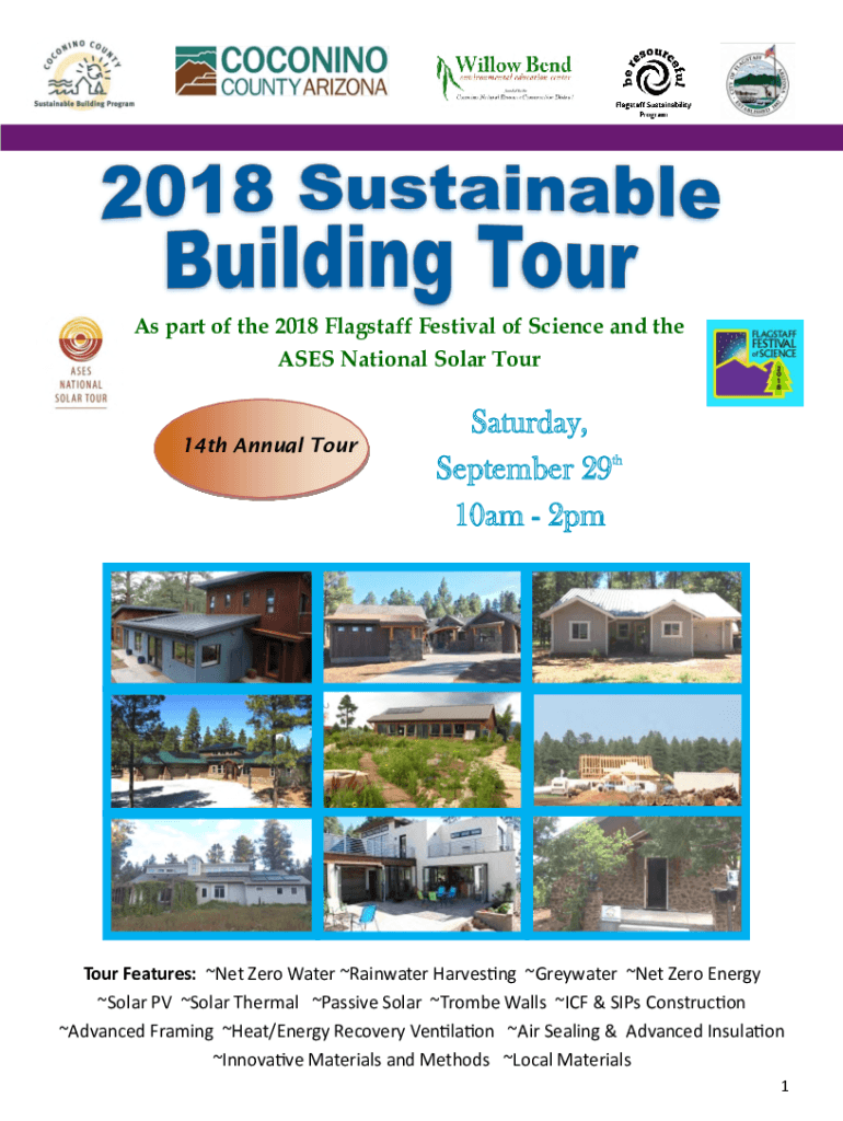As part of the 2018 Flagstaff Festival of Science and the CASES National Solar Tour14th Annual Tour Saturday, September 29th 10am 2pmTour Features: Net Zero Water Rainwater Harvesting Grey water Net