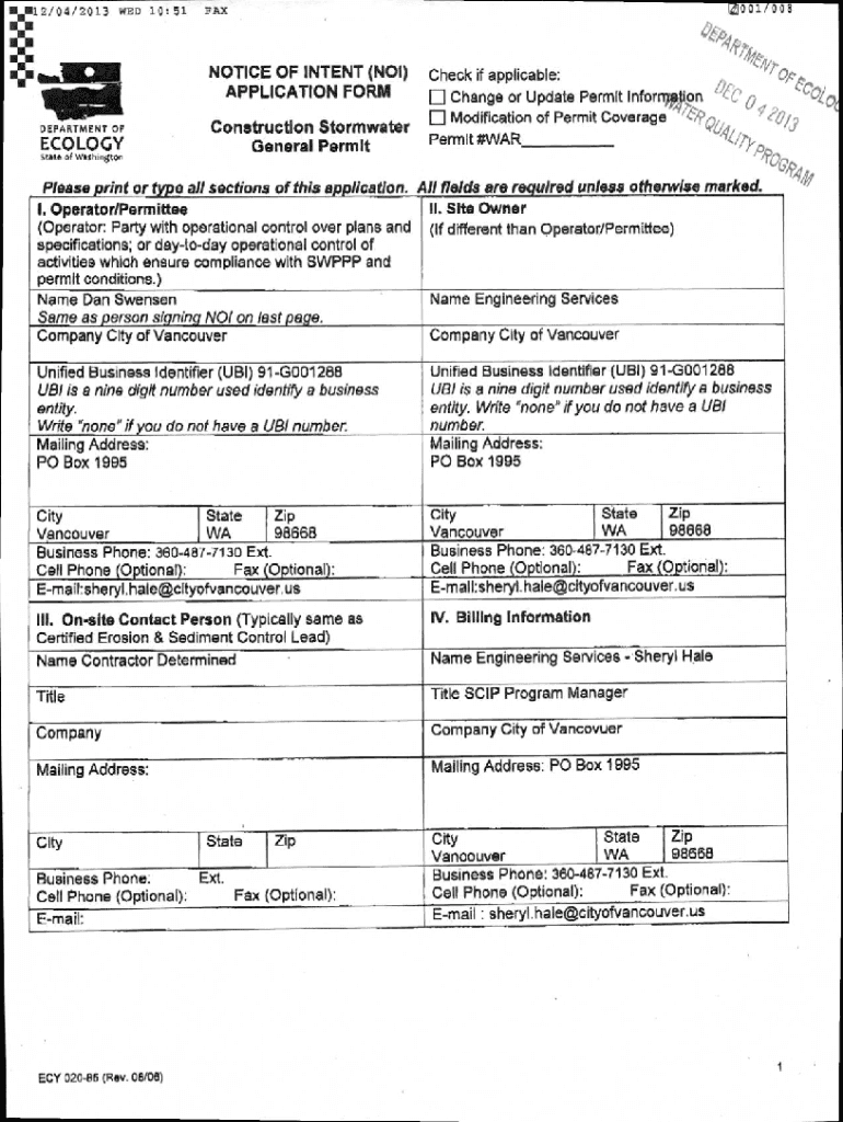 WED 10:51FAXfyNOTICE OF INTENT (N01) APPLICATION FORM DEPARTMENT ECOLOGY State of WashingtonConstruction Stormwater General PermitiCheck if applicable: 71/r10,4. 44\'Coin 0 ton Inform Information