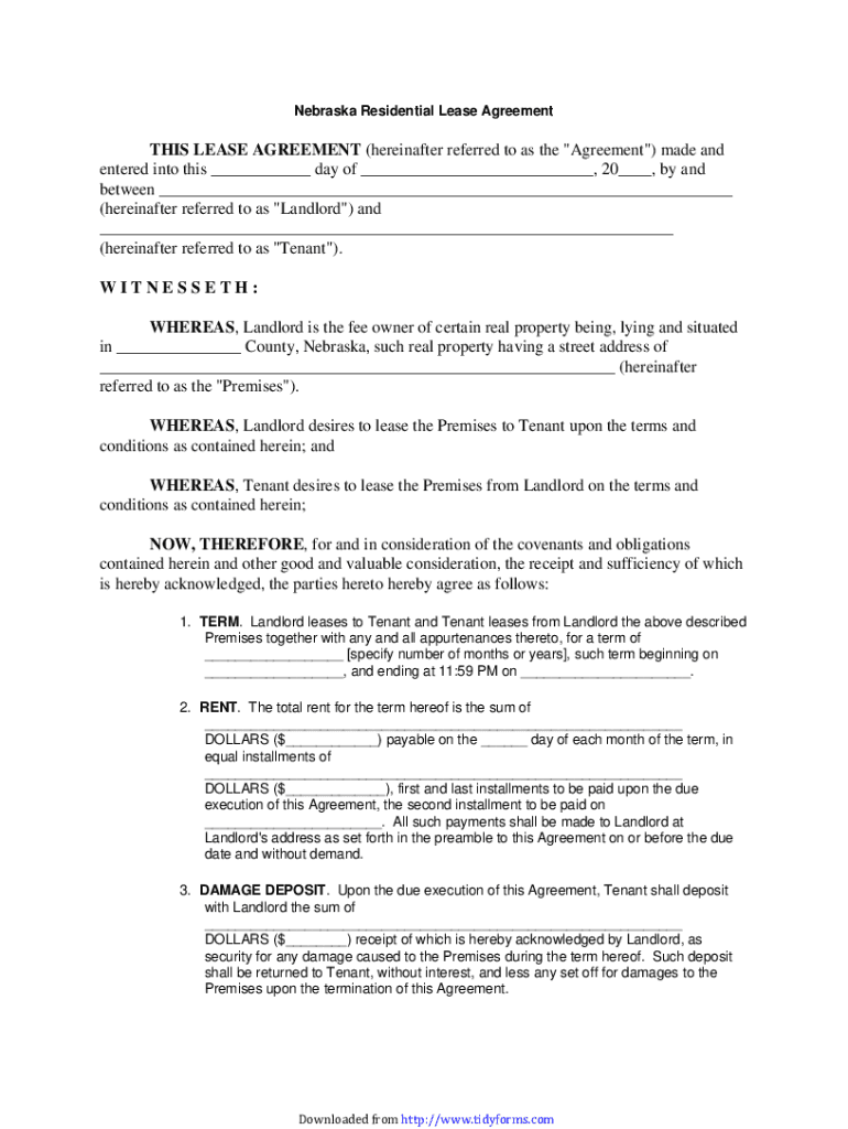 Nebraska Residential Lease Agreements LEASE AGREEMENT (hereinafter referred to as the \” Agreement\”) made and entered into this ___ day of ___, 20___, by and between ___ (hereinafter referred