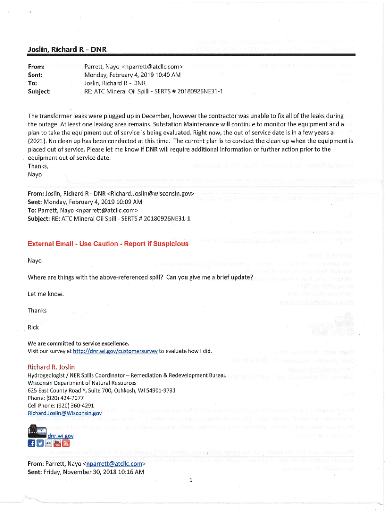 Joplin, Richard R DNR From: Barrett, NATO nparrett@atcllc.com Sent: Monday, February 4, 201 9 10:40 AM To: Joplin, Richard R Subject: RE: ATC Mineral Oil Spill SEATS # 20180926NE311The transformer