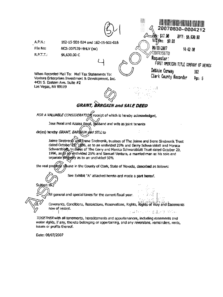 . A.P.N.:16215501024and 16215501016File No:NCS307539HHLV (AK)R.P.T.T.$6,630.00Cy When Recorded Mail To: Mail Tax Statements To: Ventura Enterprises Investment & Development, Inc. 4431 S. Eastern Ave.