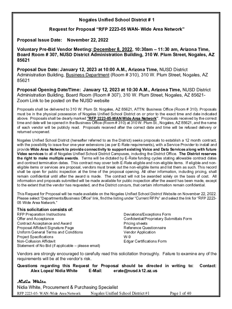 Nogales Unified School District # 1 Request for Proposal RFP 222305 WAN Wide Area Network Proposal Issue Date:November 22, 2022Voluntary PreBid Vendor Meeting: December 8, 2022, 10:30am 11:30 am,