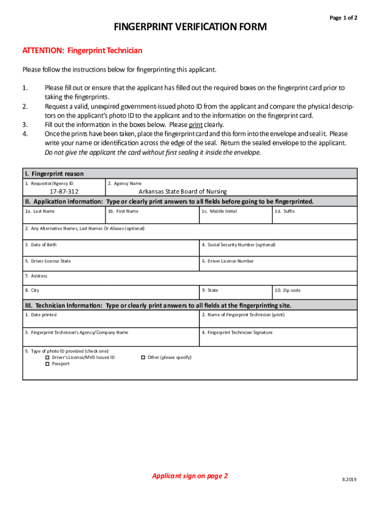 Page 1 of 2FINGERPRINT VERIFICATION FORM ATTENTION: Fingerprint Technician Please follow the instructions below for fingerprinting this applicant. 1. 2.3. 4. Please fill out or ensure that the applicant