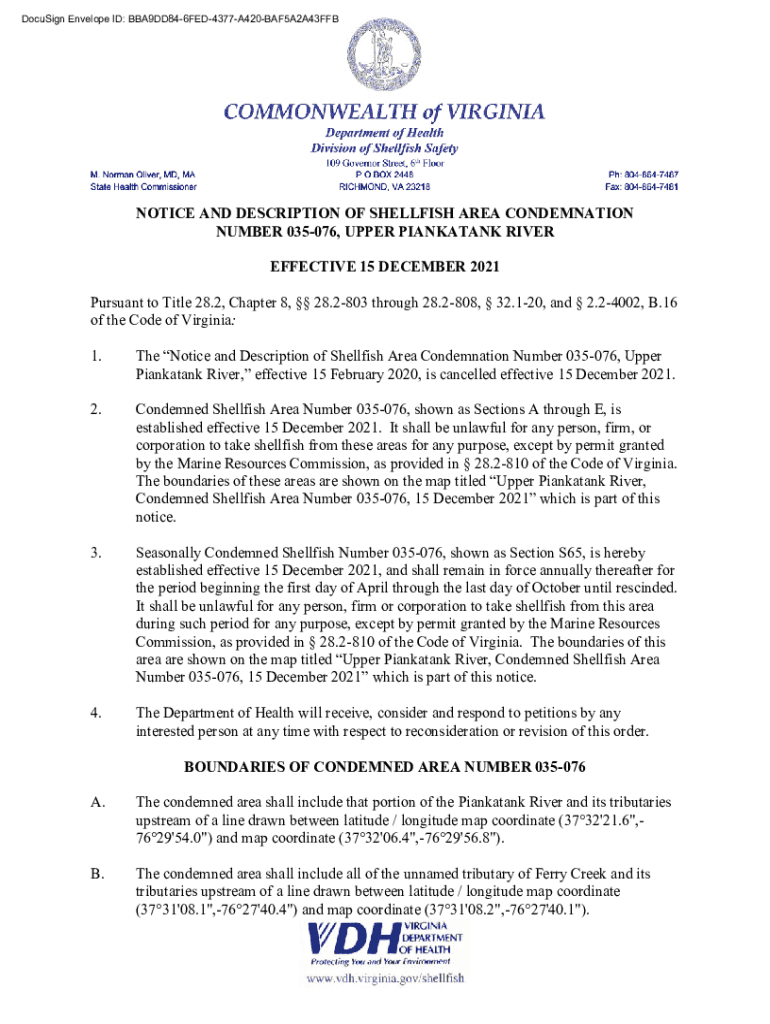 DocuSign Envelope ID: BBA9DD846FED4377A420BAF5A2A43FFBNOTICE AND DESCRIPTION OF SHELLFISH AREA CONDEMNATION