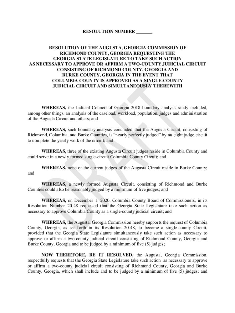 RESOLUTION NUMBER ___RESOLUTION OF THE AUGUSTA, GEORGIA COMMISSION OF RICHMOND COUNTY, GEORGIA REQUESTING THE GEORGIA STATE LEGISLATURE TO TAKE SUCH ACTION AS NECESSARY TO APPROVE OR AFFIRM A COUNTY