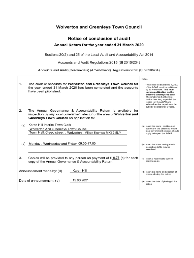 Overton and Greenland Town Council Notice of conclusion of audit Annual Return for the year ended 31 March 2020 Sections 20(2) and 25 of the Local Audit and Accountability Act 2014 Accounts and Audit