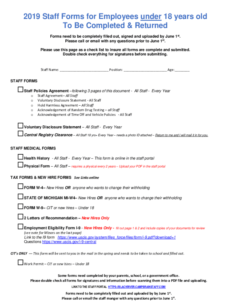 2019 Staff Forms for Employees under 18 years old To Be Completed & Returned Forms need to be completely filled out, signed and uploaded by June 1st. Please call or email with any questions prior