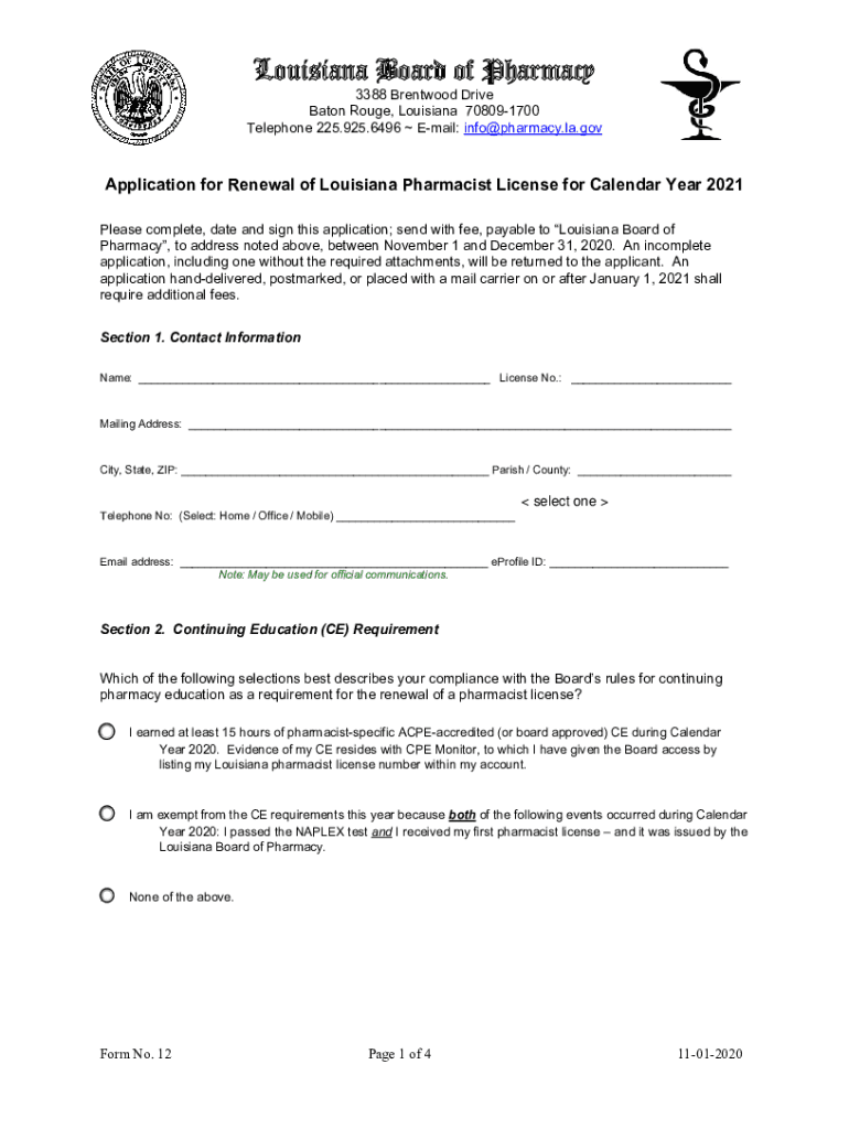 Louisiana Board of Pharmacy3388 Brentwood Drive Baton Rouge, Louisiana 708091700 Telephone 225.925.6496 Email: info@pharmacy.la.govApplication for Renewal of Louisiana Pharmacist License for Calendar