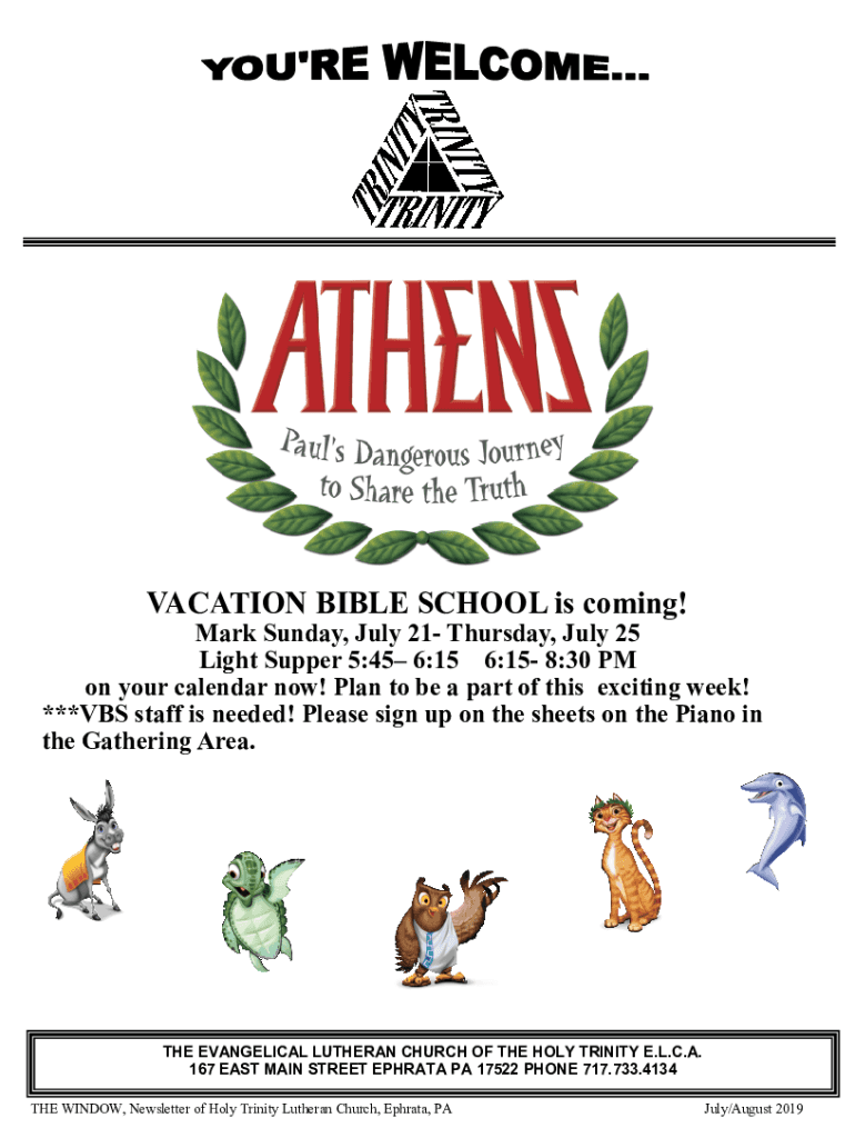 VACATION BIBLE SCHOOL is coming! Mark Sunday, July 21 Thursday, July 25 Light Supper 5:45 6:15 6:15 8:30 PM on your calendar now! Plan to be a part of this exciting week! ***VBS staff is needed! Please