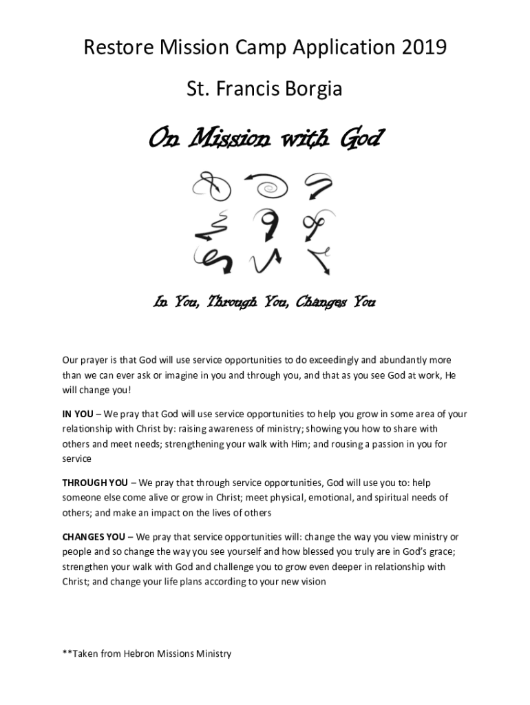 Restore Mission Camp Application 2019 St. Francis Borgia Mission with Odin You, Through You, Changes You Our prayer is that God will use service opportunities to do exceedingly and abundantly more
