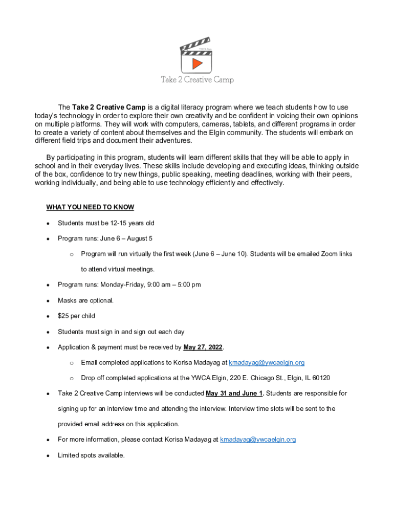 The Take 2 Creative Camp is a digital literacy program where we teach students how to use today's technology in order to explore their own creativity and be confident in voicing their own opinions