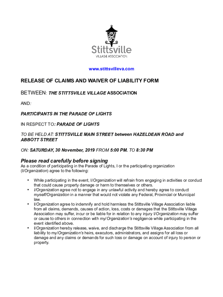 WWW.stittsvilleva.release OF CLAIMS AND WAIVER OF LIABILITY FORM BETWEEN: THE TITUSVILLE VILLAGE ASSOCIATION AND: PARTICIPANTS IN THE PARADE OF LIGHTS IN RESPECT TO: PARADE OF LIGHTS TO BE HELD AT: