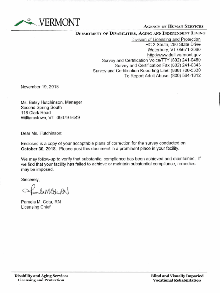 VERMONTAGENCY OF HUMAN SERVICESDEPARTMENT OF DISABILITIES, AGING AND INDEPENDENT LIVINGDivision of Licensing and Protection HC 2 South, 280 State Drive Waterbury, VT 056712060 http://www.dail.vermont.qov