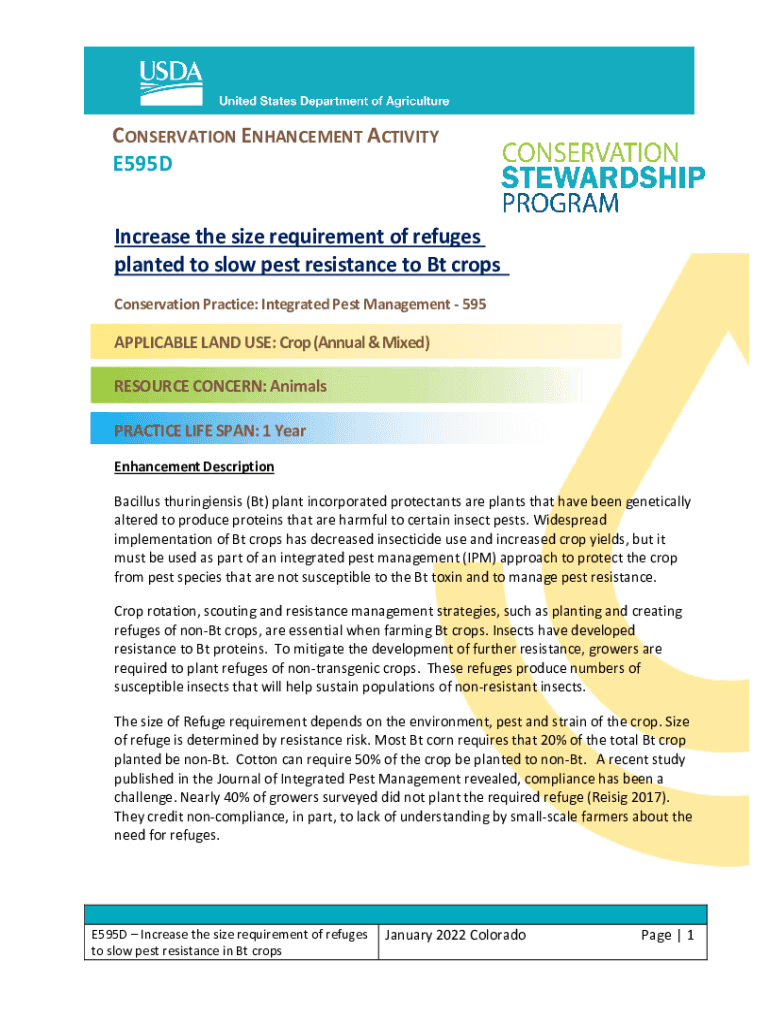 CONSERVATION ENHANCEMENT ACTIVITY E595D Increase the size requirement of refuges planted to slow pest resistance to BT crops Conservation Practice: Integrated Pest Management 595APPLICABLE LAND USE: