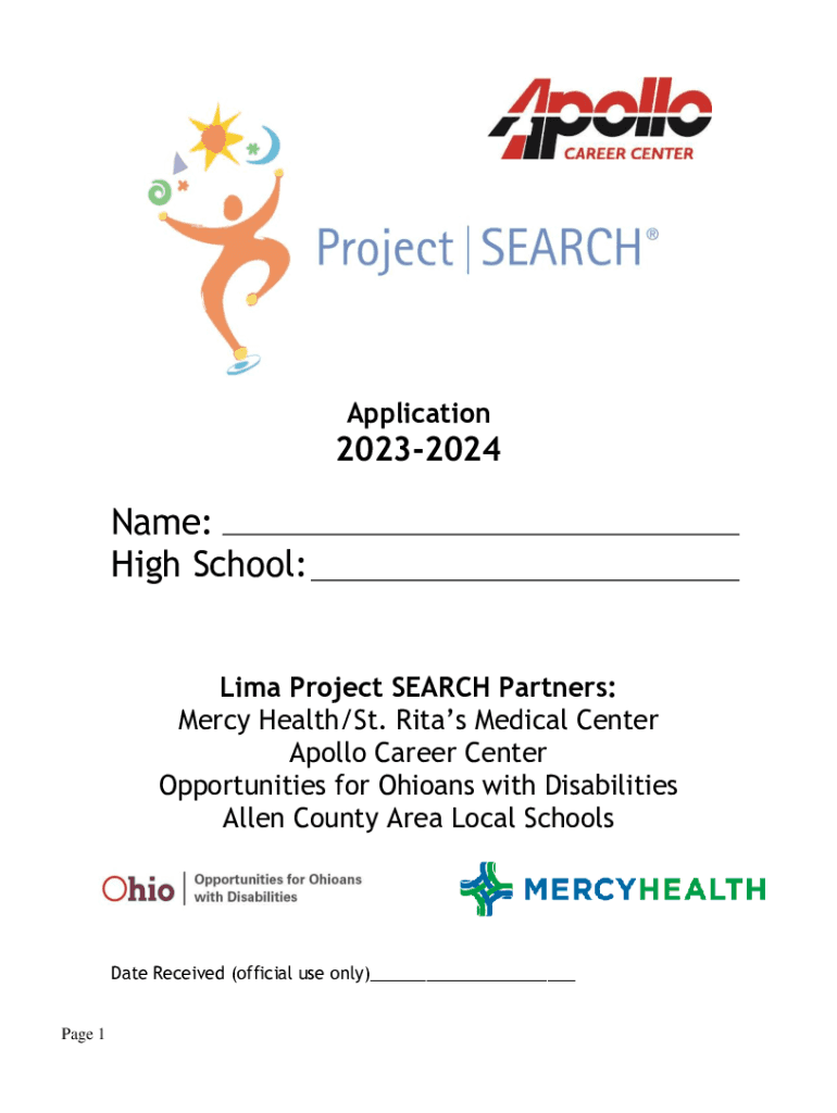 Application20232024Name: High School: Lima Project SEARCH Partners: Mercy Health/St. Rita's Medical Center Apollo Career Center Opportunities for Ohioans with Disabilities Allen County Area Local