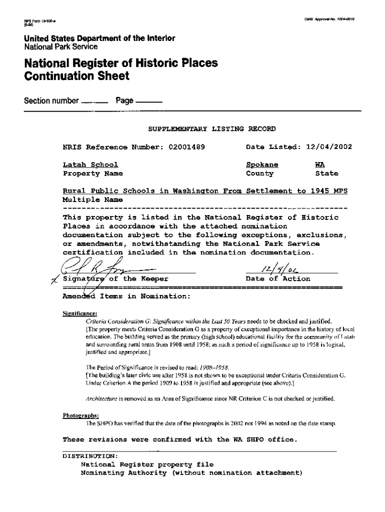 OMB Am\” a * 102418NPS Form 10900a (886)United States Department of the Interior National Park ServiceNational Register of Historic Places Continuation Sheet Section number Page SUPPLEMENTARY LISTING