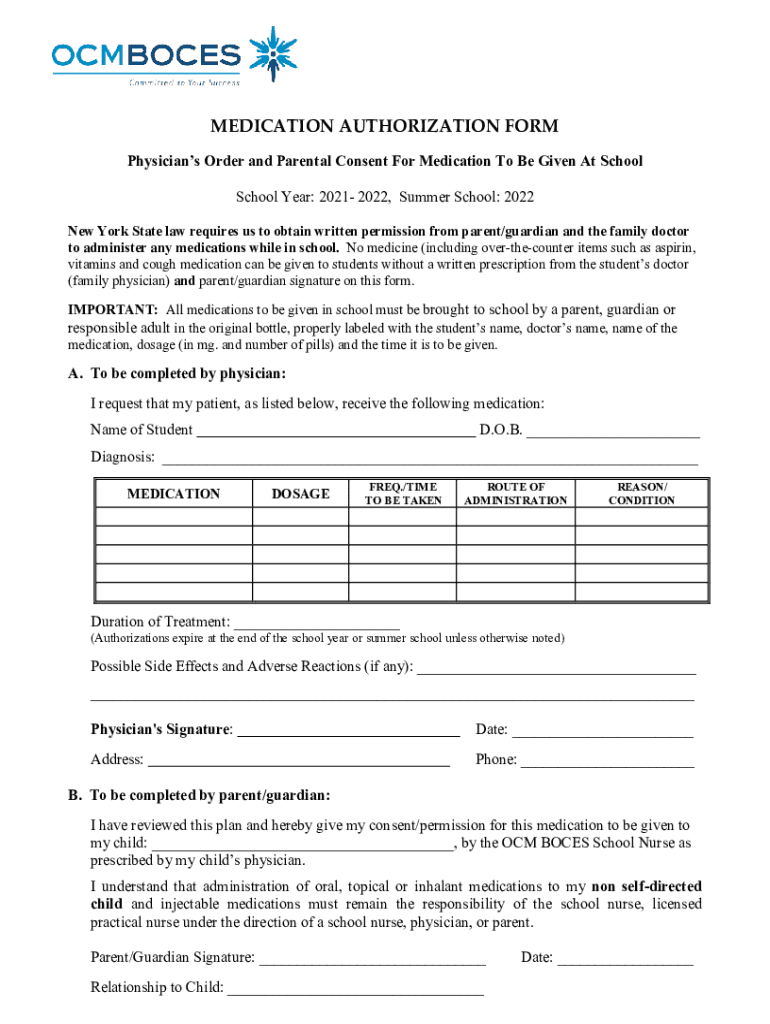 MEDICATION AUTHORIZATION FORM Physicians Order and Parental Consent For Medication To Be Given At School Year: 2021 2022, Summer School: 2022 New York State law requires us to obtain written permission