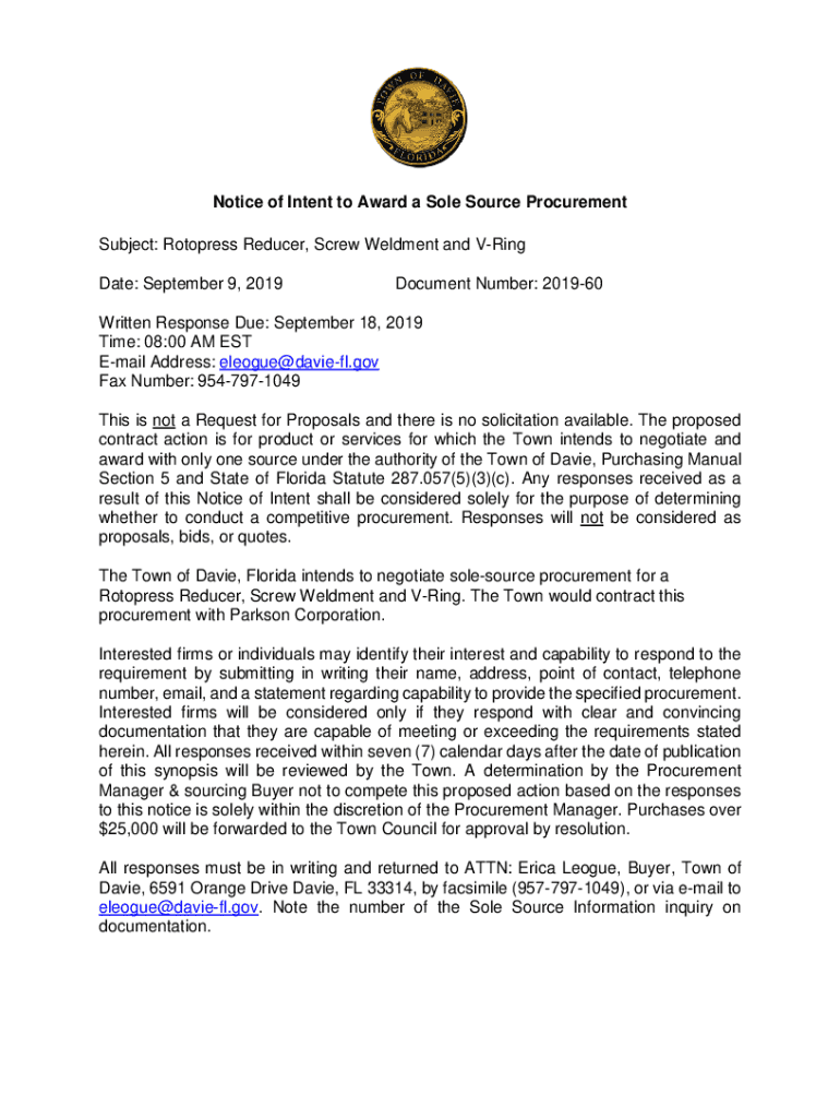 Notice of Intent to Award a Sole Source Procurement Subject: Rotors Reducer, Screw Element and Bring Date: September 9, 2019Document Number: 201960Written Response Due: September 18, 2019, Time: 08:00
