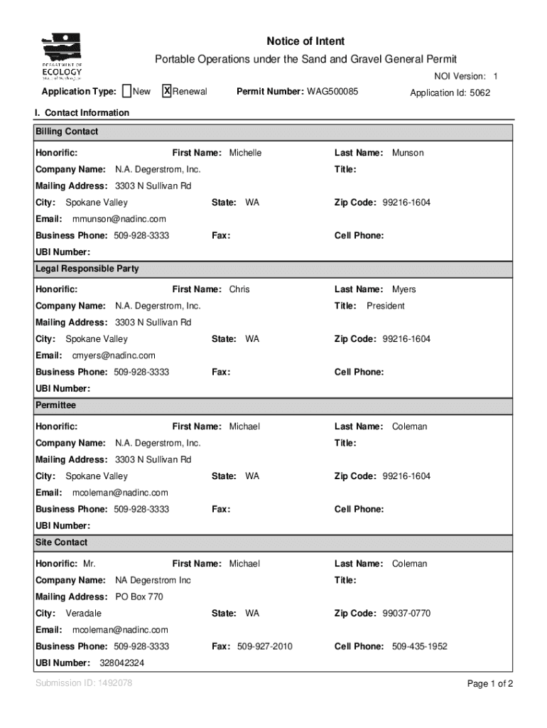Notice of Intent Portable Operations under the Sand and Gravel General Permit NOI Version: 1 Application Type:New RenewalPermit Number: WAG500085Application I'd: 5062I. Contact Information Billing