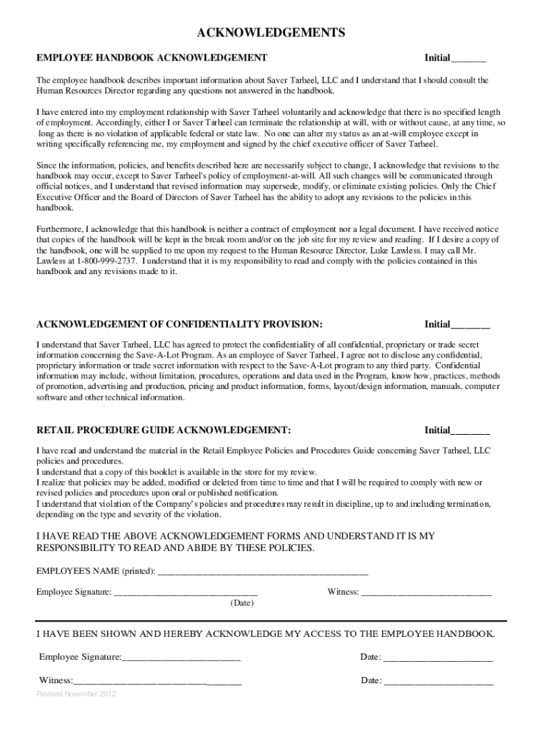 ACKNOWLEDGEMENTS EMPLOYEE HANDBOOK ACKNOWLEDGEMENTInitial___The employee handbook describes important information about Saver Tar heel, LLC and I understand that I should consult the Human Resources