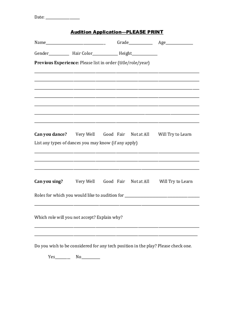Name___Grade___Age___Gender___Hair Color___ Height___Previous Experience: Please list in order (title/role/year)___