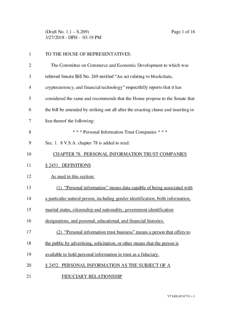 (Draft No. 1.1 S.269) 3/27/2018 DPH 03:19 PM1 2Page 1 of 16TO THE HOUSE OF REPRESENTATIVES: The Committee on Commerce and Economic Development to which was3referred Senate Bill No. 269 entitled An