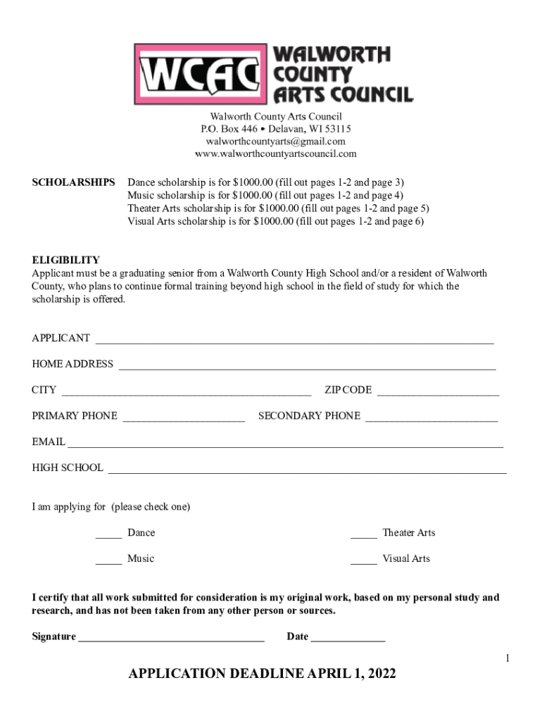 SCHOLARSHIPSDance scholarship is for $1000.00 (fill out pages 12 and page 3) Music scholarship is for $1000.00 (fill out pages 12 and page 4) Theater Arts scholarship is for $1000.00 (fill out pages
