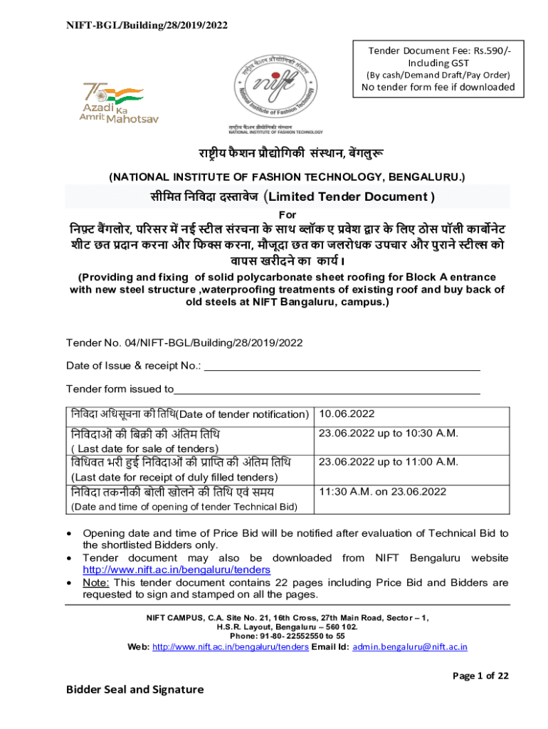 NIFTY/Building/28/2019/2022 Tender Document Fee: Rs.590/Including GST (By cash/Demand Draft/Pay Order)No tender form fee if downloaded, (NATIONAL INSTITUTE OF FASHION TECHNOLOGY, BENGALURU.) (Limited