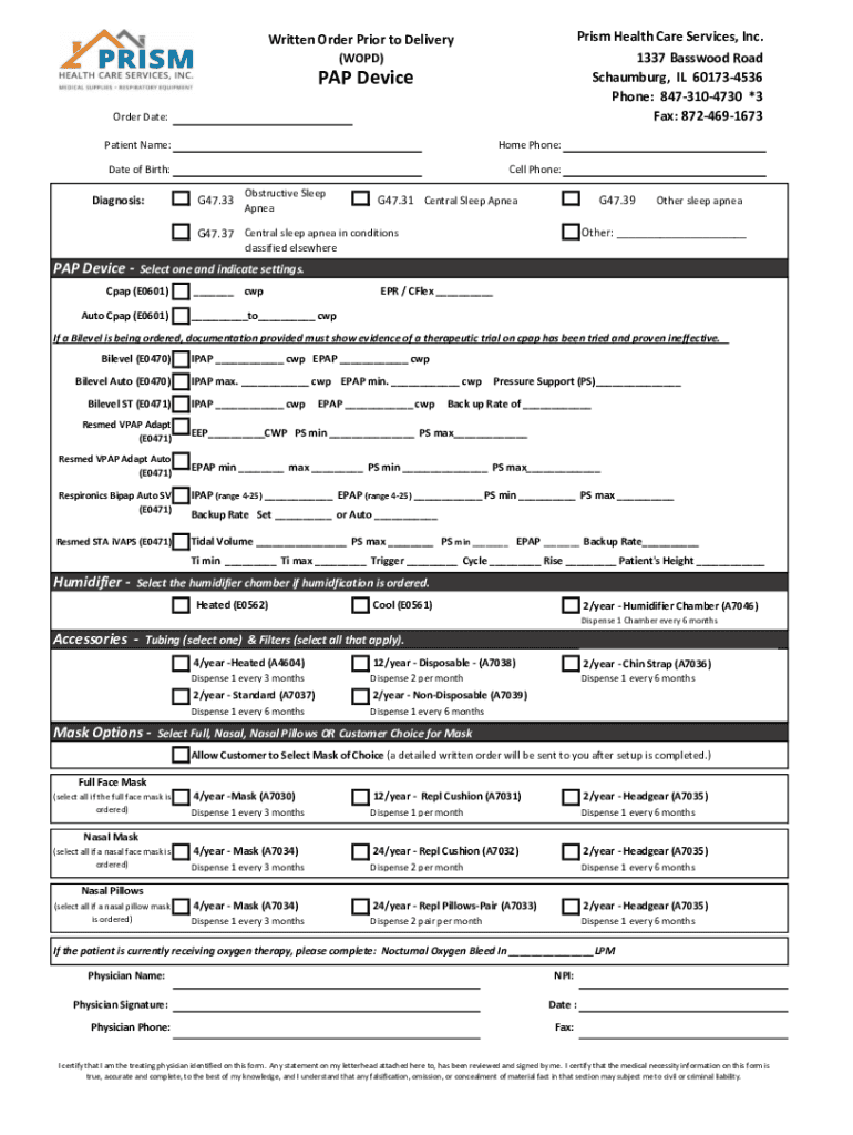 Prism Health Care Services, Inc. 1337 Basswood Road Schaumburg, IL 601734536 Phone: 8473104730 ×3 Fax: 8724691673Written Order Prior to Delivery (WORD)PAP Device Order Date: Patient Name:Home Phone:Date