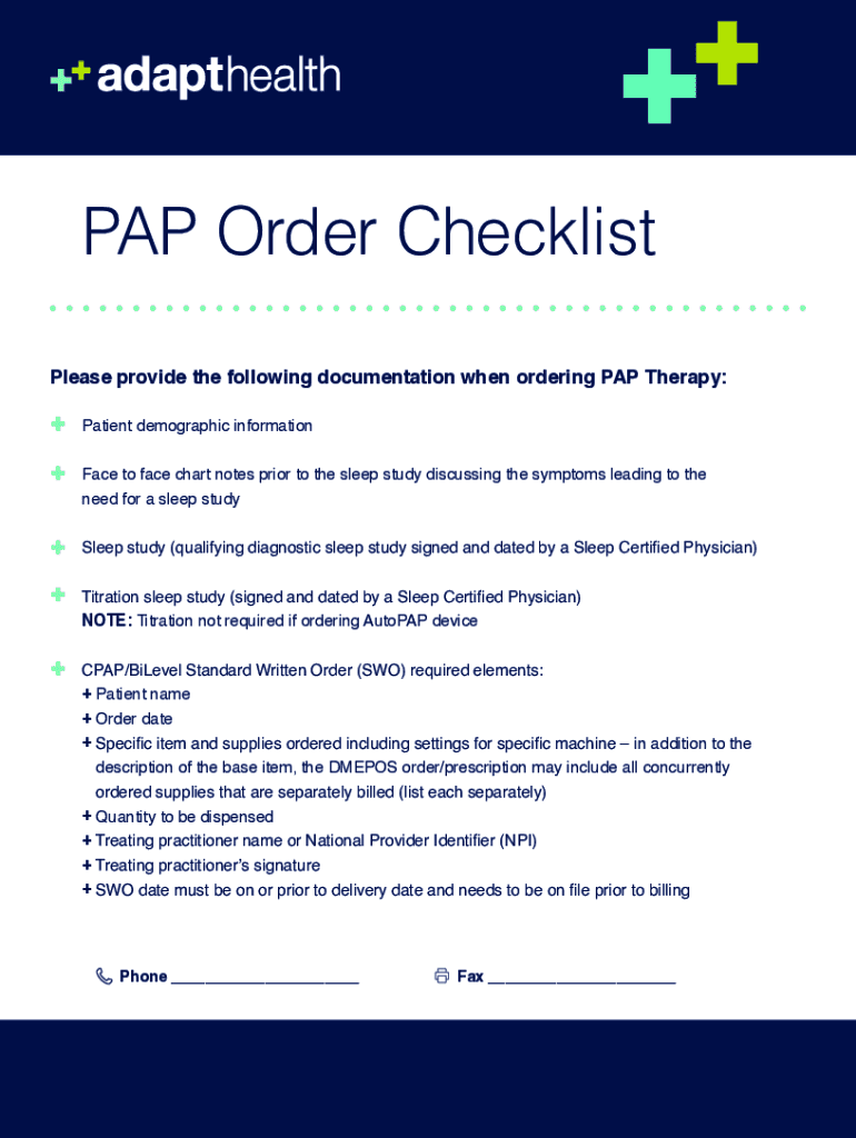 PAP Order Checklist Please provide the following documentation when ordering PAP Therapy: Patient demographic information Face to face chart notes prior to the sleep study discussing the symptoms