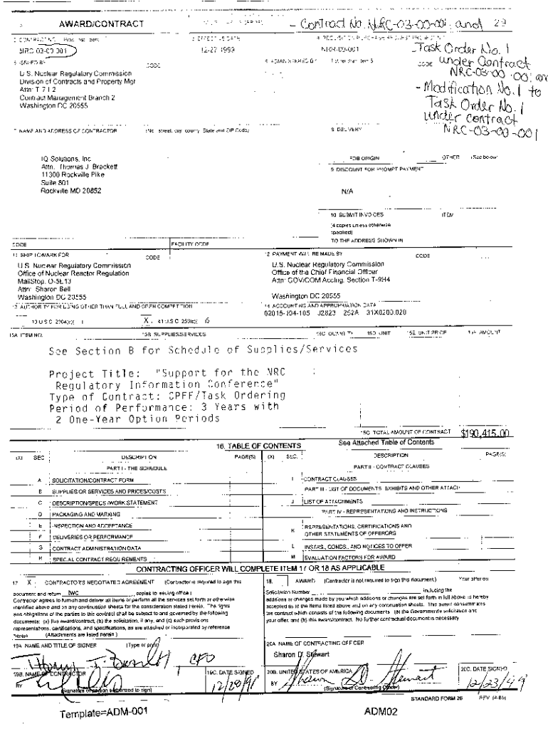 .:onward/CONTRACT 122719991IRC030] SSL:ED 8\', \” VA.AA\';RIS:Ed Etc KB.go, o O0SkNRR00001 (,0D E......... IFR:4eB29 rd(Act do QFC. Q, \'. C ODER S Nuclear Regulatory Commission Division of Contracts