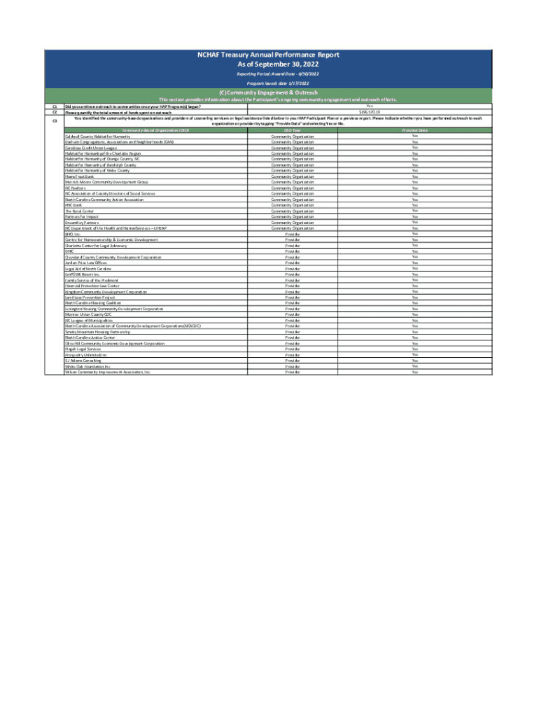 NCAA Treasury Annual Performance Report As of September 30, 2022, Reporting Period: Award Date 9/30/2022 Program launch date 1/17/2022© Community Engagement & Outreaches section provides information