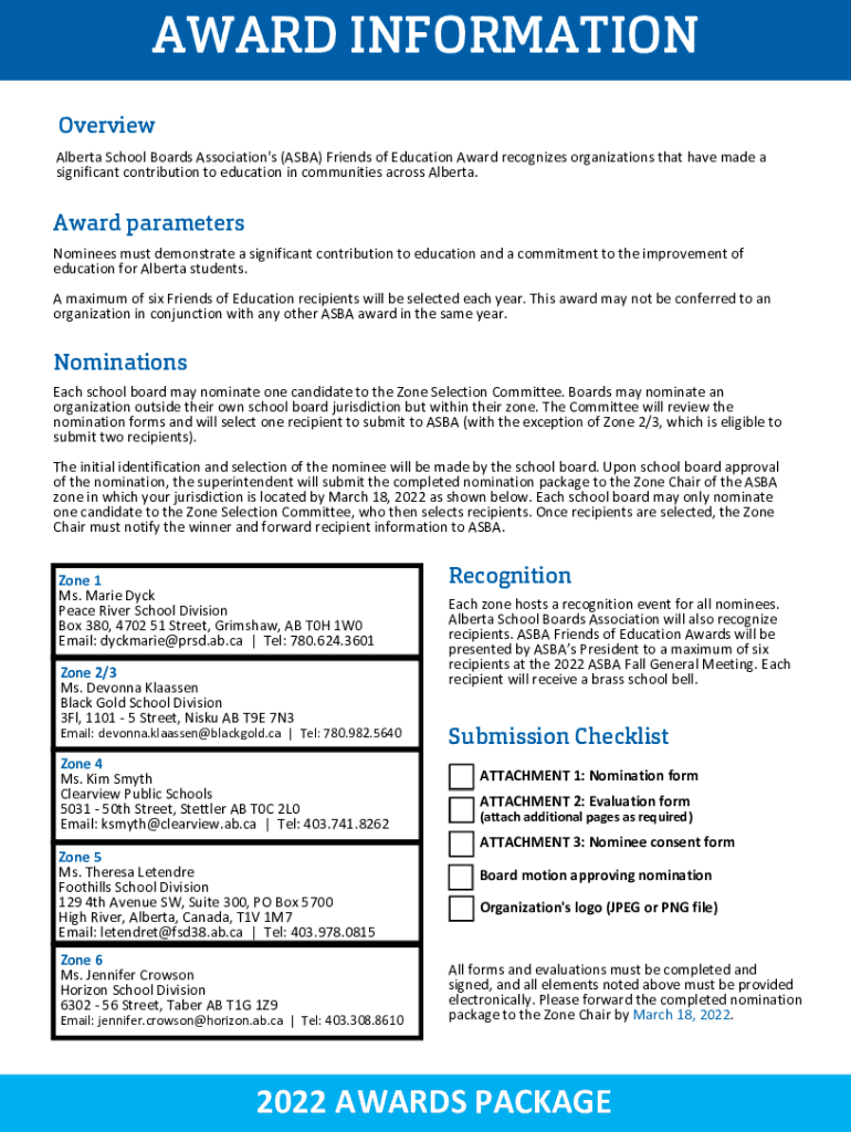 FRIENDS OF EDUCATION2022 AWARDS PACKAGEAWARD INFORMATION Overview Alberta School Boards Association\'s (ASIA) Friends of Education Award recognizes organizations that have made a significant contribution