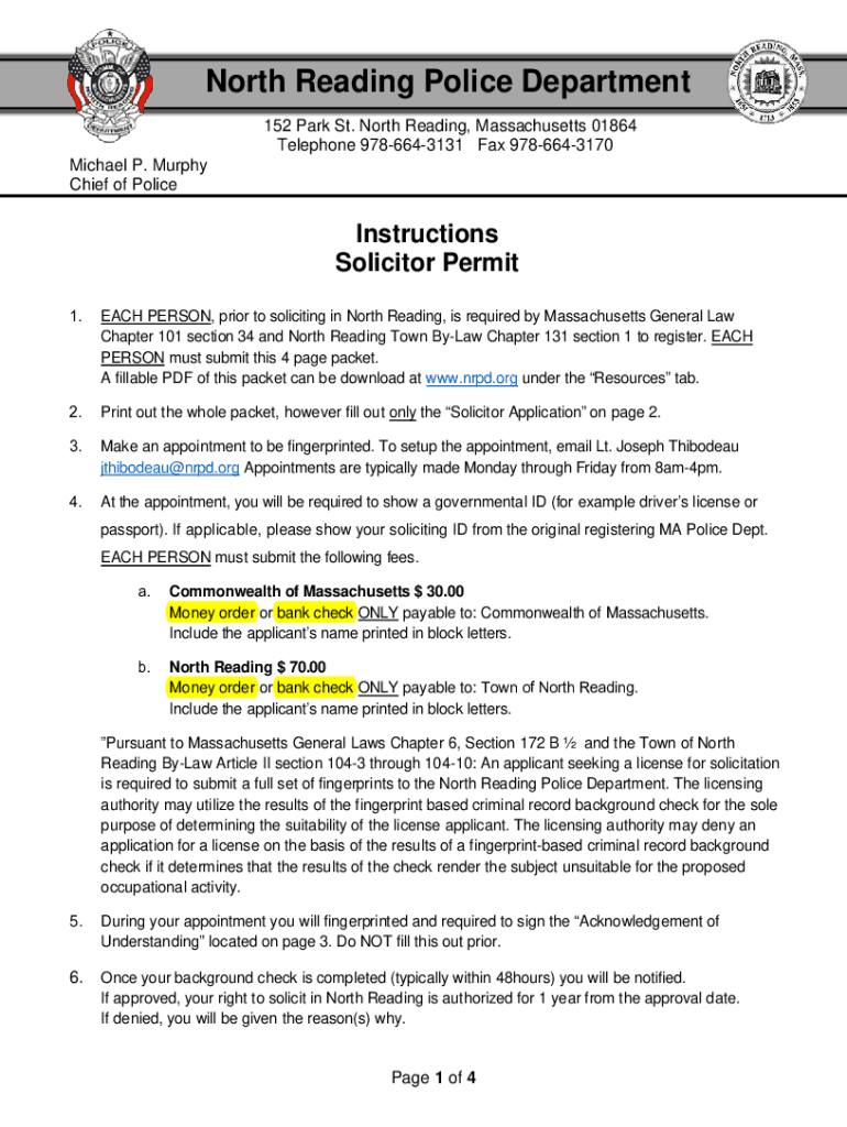 North Reading Police Department 152 Park St. North Reading, Massachusetts 01864 Telephone 9786643131 Fax 9786643170 Michael P. Murphy Chief of PoliceInstructions Solicitor Permit 1.EACH PERSON, prior