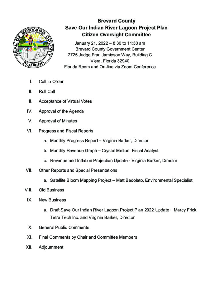 Brevard County Save Our Indian River Lagoon Project Plan Citizen Oversight Committee January 21, 2022 8:30 to 11:30 am Brevard County Government Center 2725 Judge Fran Jamieson Way, Building C Vera,
