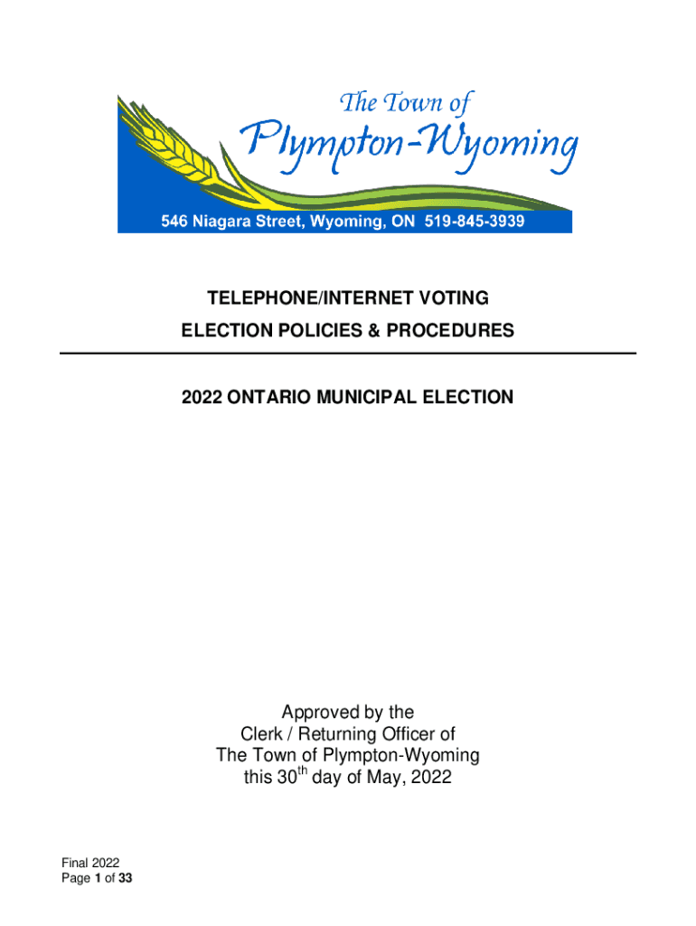 TELEPHONE/INTERNET VOTING ELECTION POLICIES & PROCEDURES2022 ONTARIO MUNICIPAL ELECTIONApproved by the Clerk / Returning Officer of The Town of PlymptonWyoming this 30th day of May, 2022Final 2022-Page