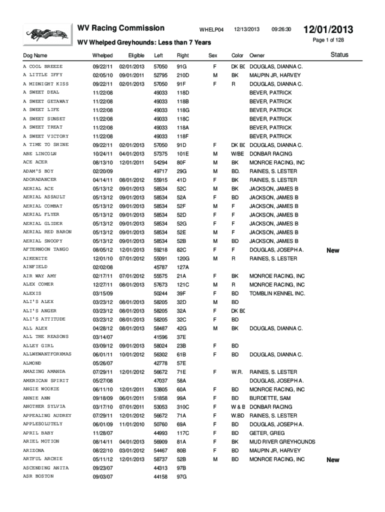 WV Racing CommissionWHELP0412/13/201309:26:3012/01/2013-Page 1 of 128WV Whelped Greyhounds: Less than 7 Years