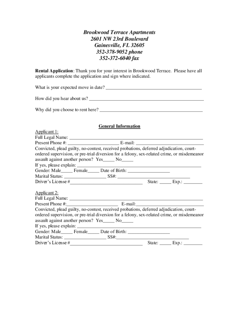 Brook wood Terrace Apartments 2601 NW 23rd Boulevard Gainesville, FL 32605 3523789052 phone 3523726040 fax Rental Application: Thank you for your interest in Brook wood Terrace. Please have all applicants