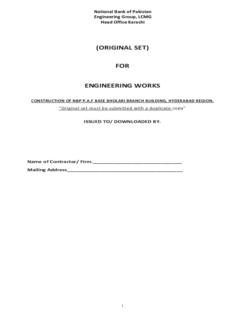 National Bank of Pakistan Engineering Group, CMG Head Office Karachi(ORIGINAL SET) FOR ENGINEERING WORKS CONSTRUCTION OF BNP P.A.F BASE BHILAI BRANCH BUILDING, HYDERABAD REGION.\” Original set must