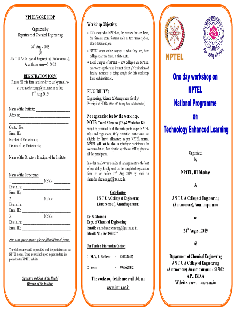 NPTEL WORK SHOPOrganized by Department of Chemical Engineering th24 Aug 2019 @ J N T U A College of Engineering (Autonomous), Ananthapuramu515002 REGISTRATION FORM Please fill this form and send it
