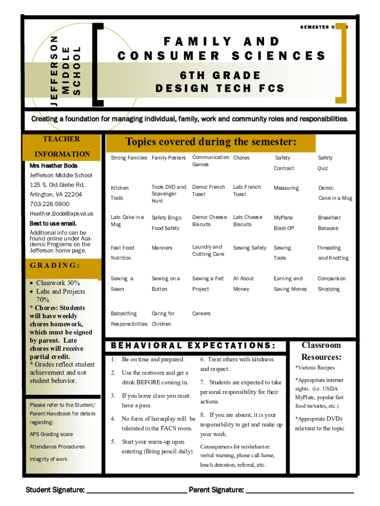 SEMESTER CLASSJEFFERSON MIDDLE SCHOOLMATE LY AN D C ON SUMMER SC I EN C ES 6TH GRADE DESIGN TECH Cocreating a foundation for managing individual, family, work and community roles and responsibilities.