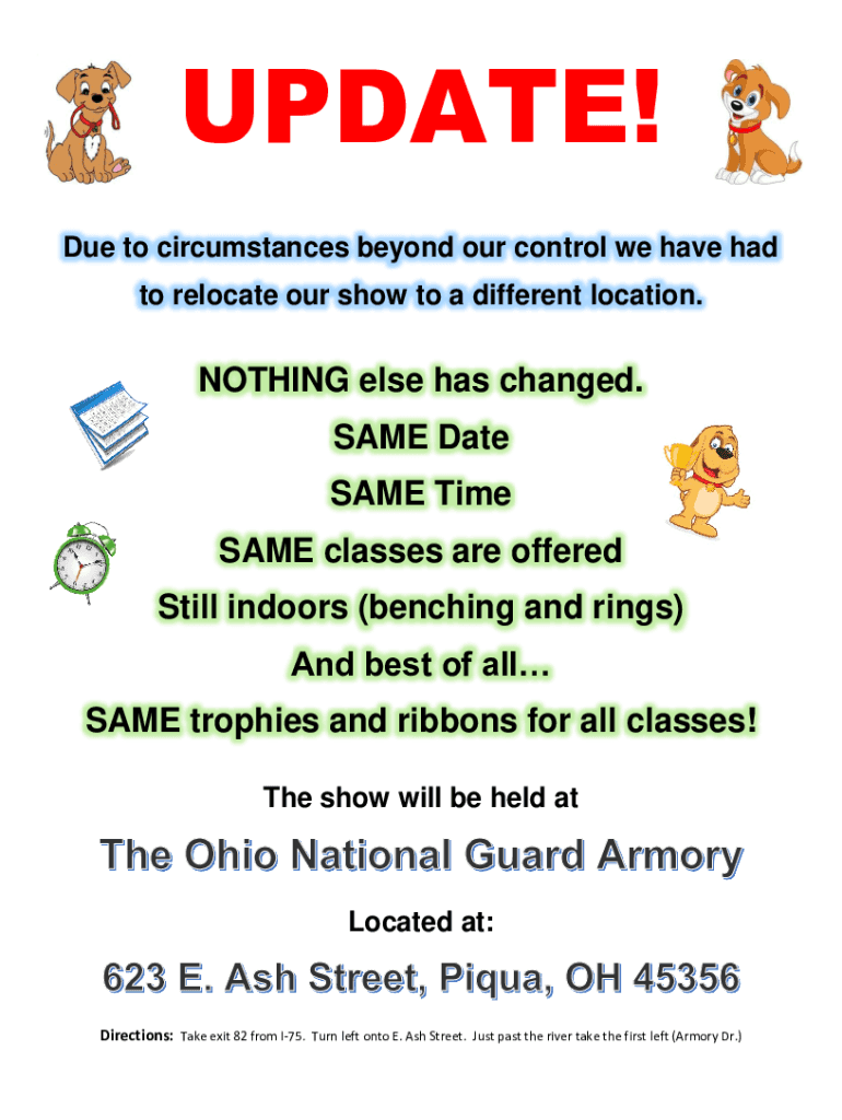 UPDATE! Due to circumstances beyond our control we have had to relocate our show to a different location. NOTHING else has changed. SAME Date SAME Time SAME classes are offered Still indoors (benching