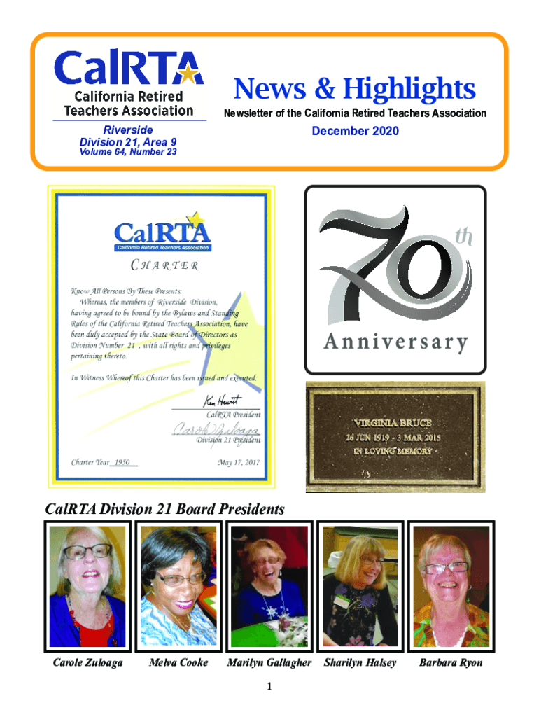 News & Highlights Newsletter of the California Retired Teachers Association December 2020Riverside Division 21, Area 9Volume 64, Number 23CalRTA Division 21 Board Presidents Carole ZuloagaMelva Cooke