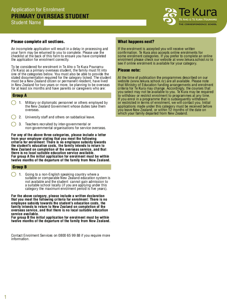 Application for EnrolmentPRIMARY OVERSEAS STUDENT Nameplate complete all sections. What happens next? An incomplete application will result in a delay in processing and your form may be returned to