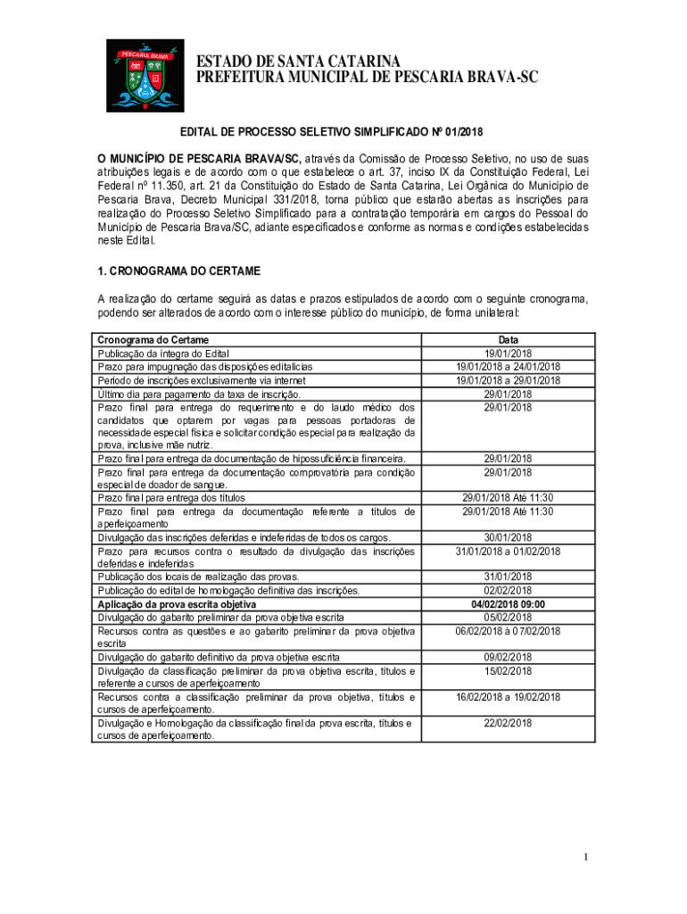 ESTATE DE SANTA CATARINA PREFECTURE MUNICIPAL DE PESC ARIA BRAVADO EDIT AL DE PROCESS SELECTIVE SIMPLIFIED N 01/2018 O MUNICIPAL DE PESC ARIA BRAVE/SC, trans the Comics de Processo Selective, no us