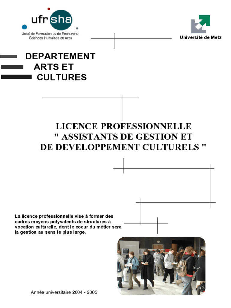University de MetzDEPARTEMENT ARTS ET CULTURESLICENCE PROFESSIONALLY \” ASSISTANTS DE SECTION ET DE DEVELOPMENT CULTURES \” La license professionally vise former DES cadres doyens polyvalence