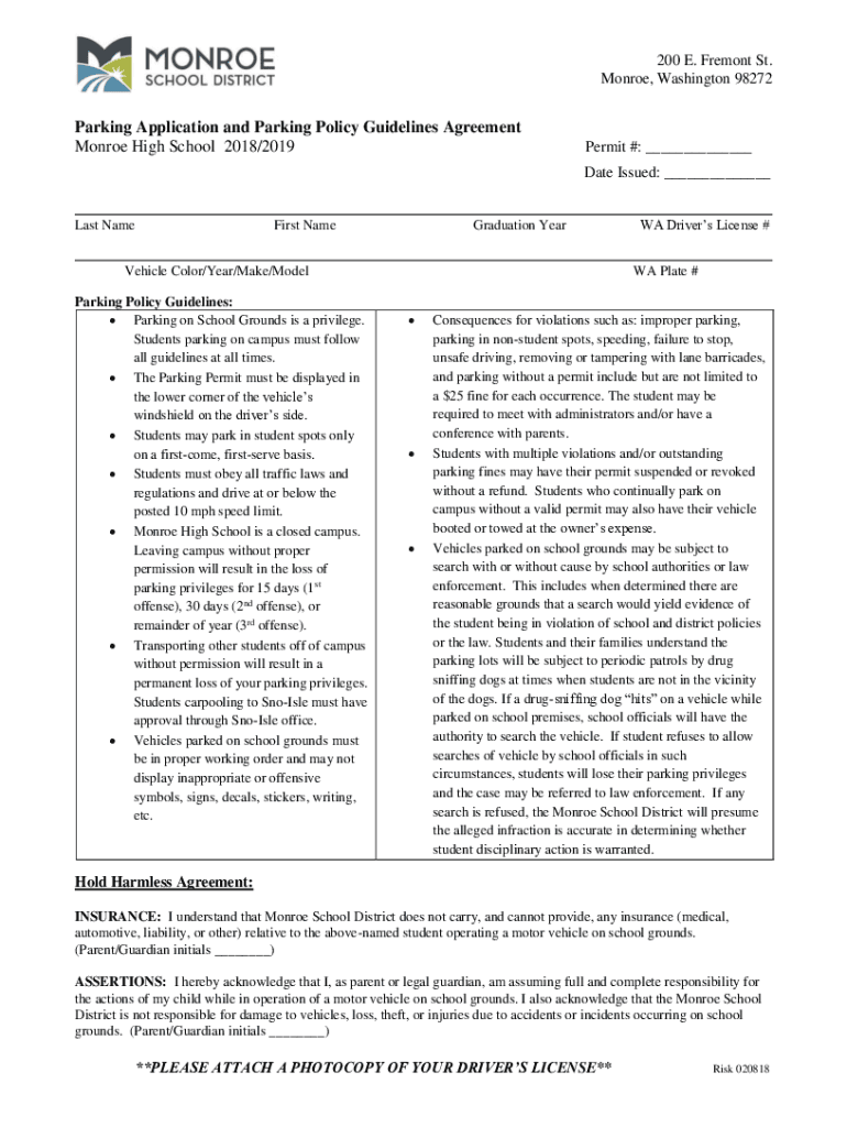 200 E. Fremont St. Monroe, Washington 98272Parking Application and Parking Policy Guidelines Agreement Monroe High School 2018/2019Permit #: ___ Date Issued: ___Last NameFirst NameGraduation YearVehicle