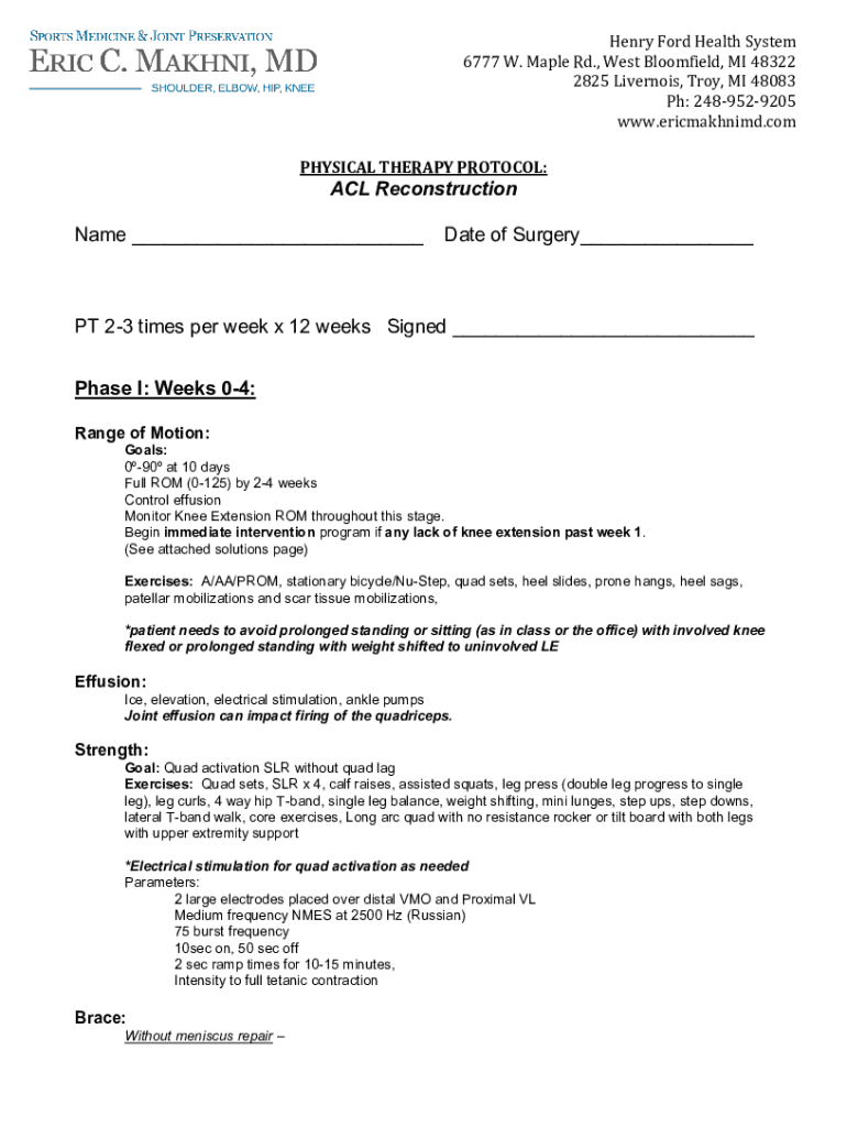 Henry Ford Health System 6777 W. Maple Rd., West Bloomfield, MI 48322 2825 Liverpool, Troy, MI 48083 pH: 2489529205 www.ericmakhnimd.com PHYSICAL THERAPY PROTOCOL:ACL Reconstruction Name ___Date of